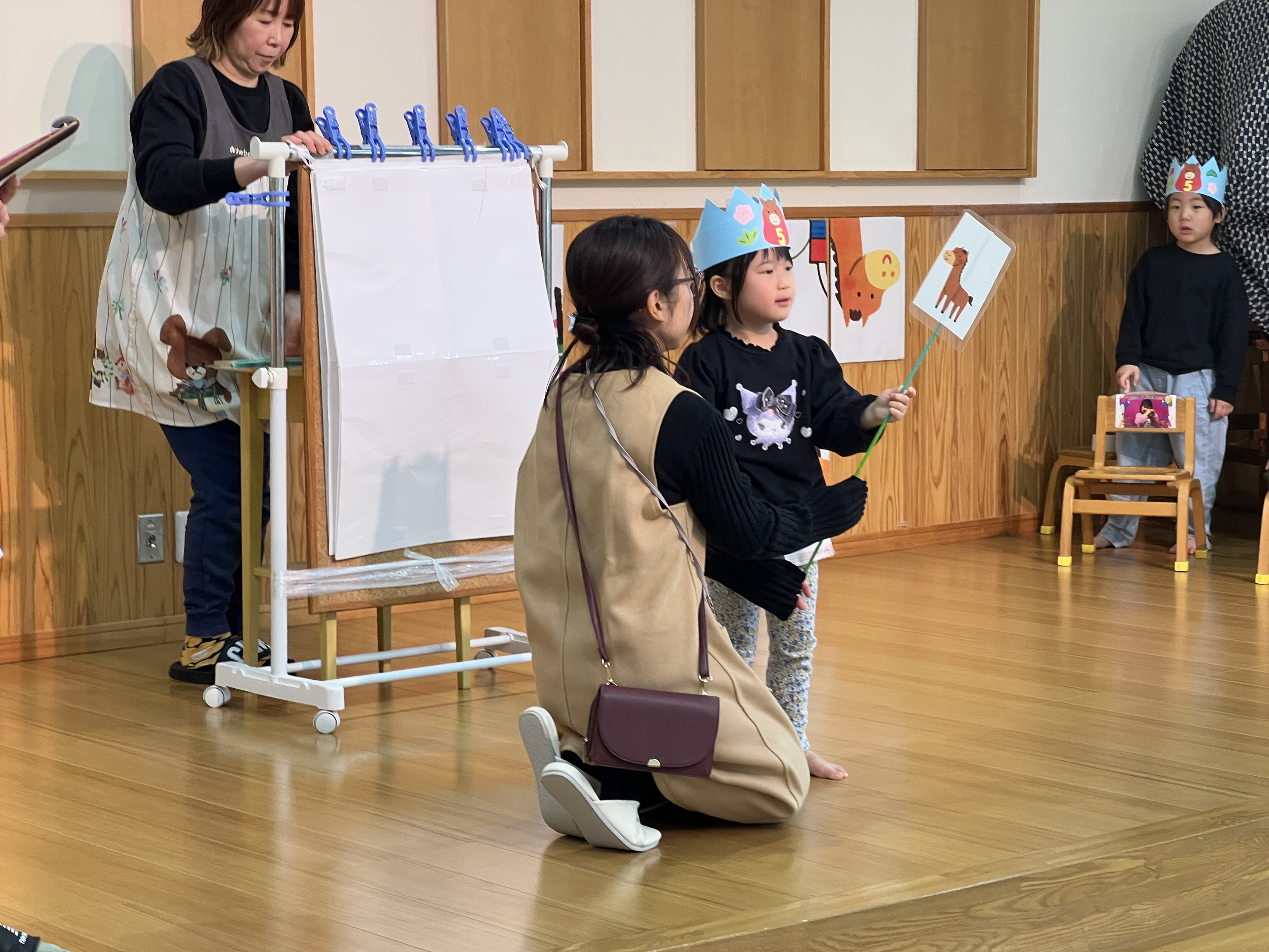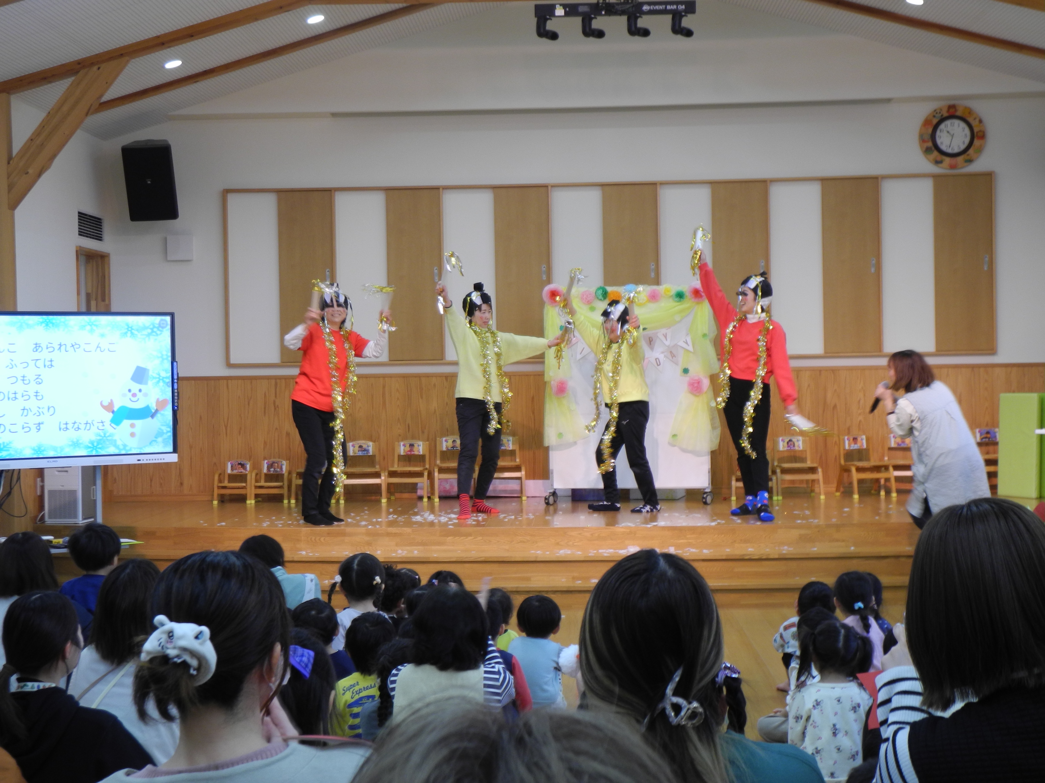 今日は12月生まれの誕生会がありましたが誕生者がとても多くてメッセージは年長クラスのみに。ご両親からの愛情いっぱいのお言葉ありがとうございました。その後は紅白歌合戦が始まり、審査待ち時間には、ゲストが登場し踊りを披露していただきましたよ。