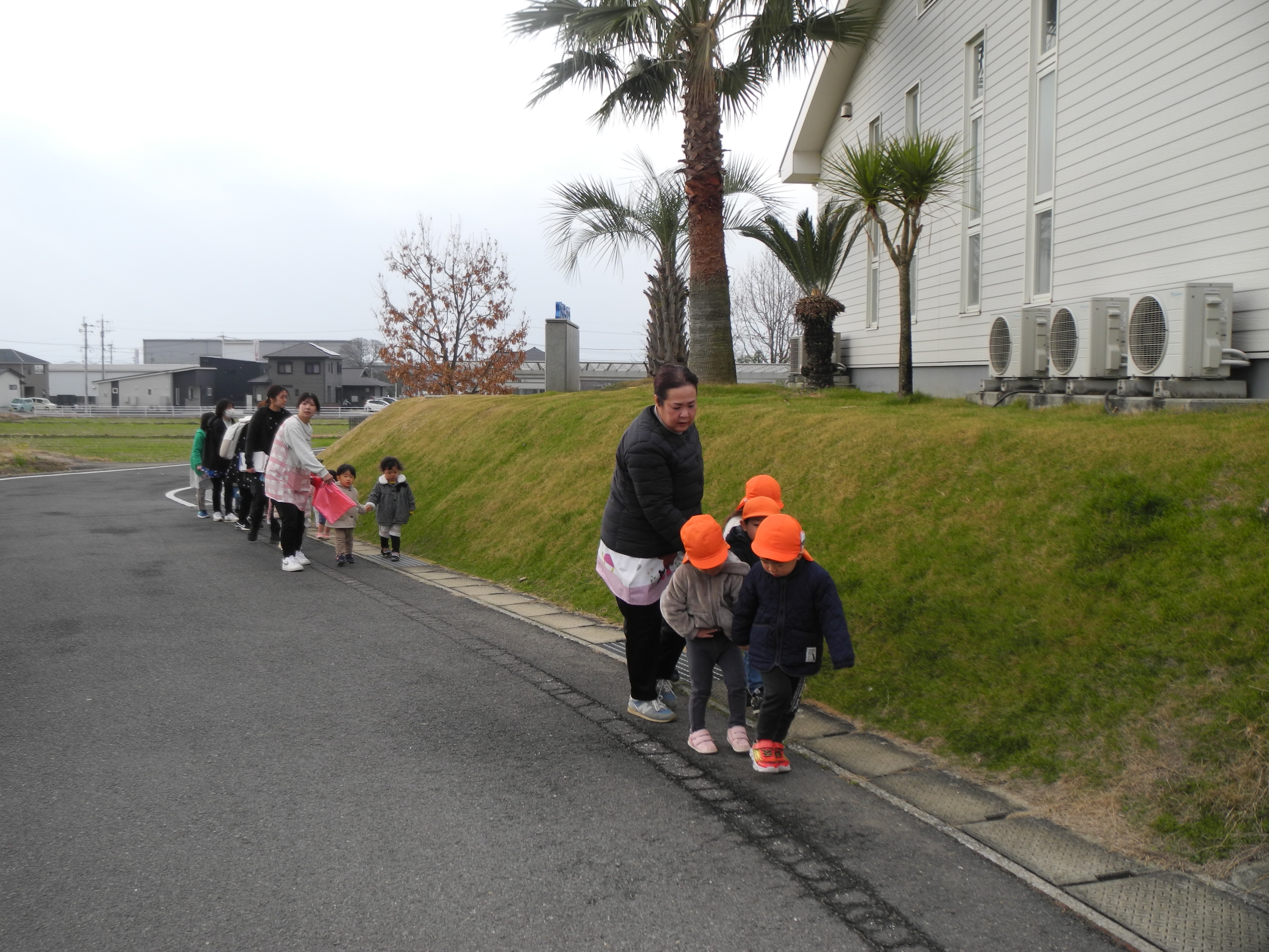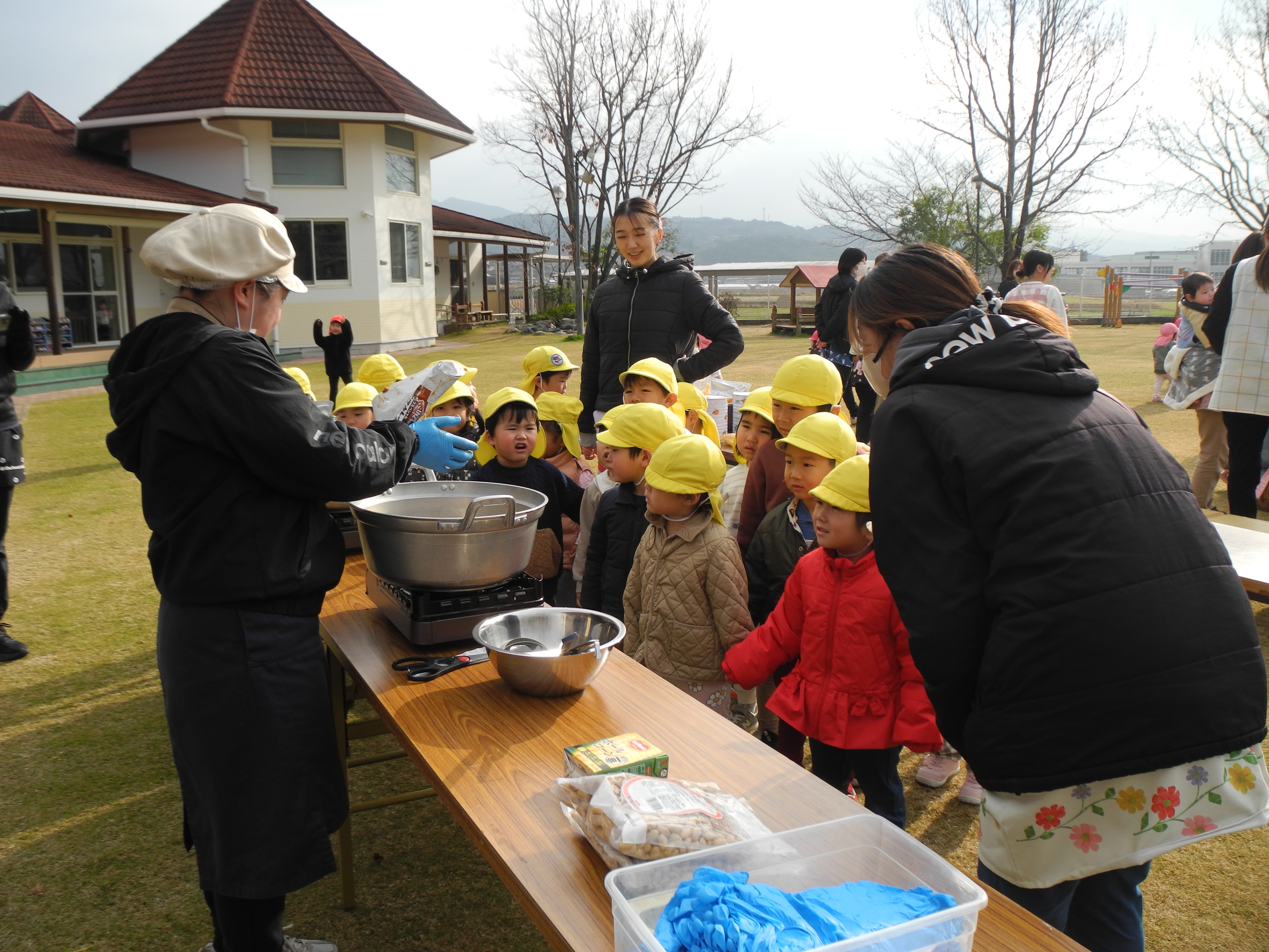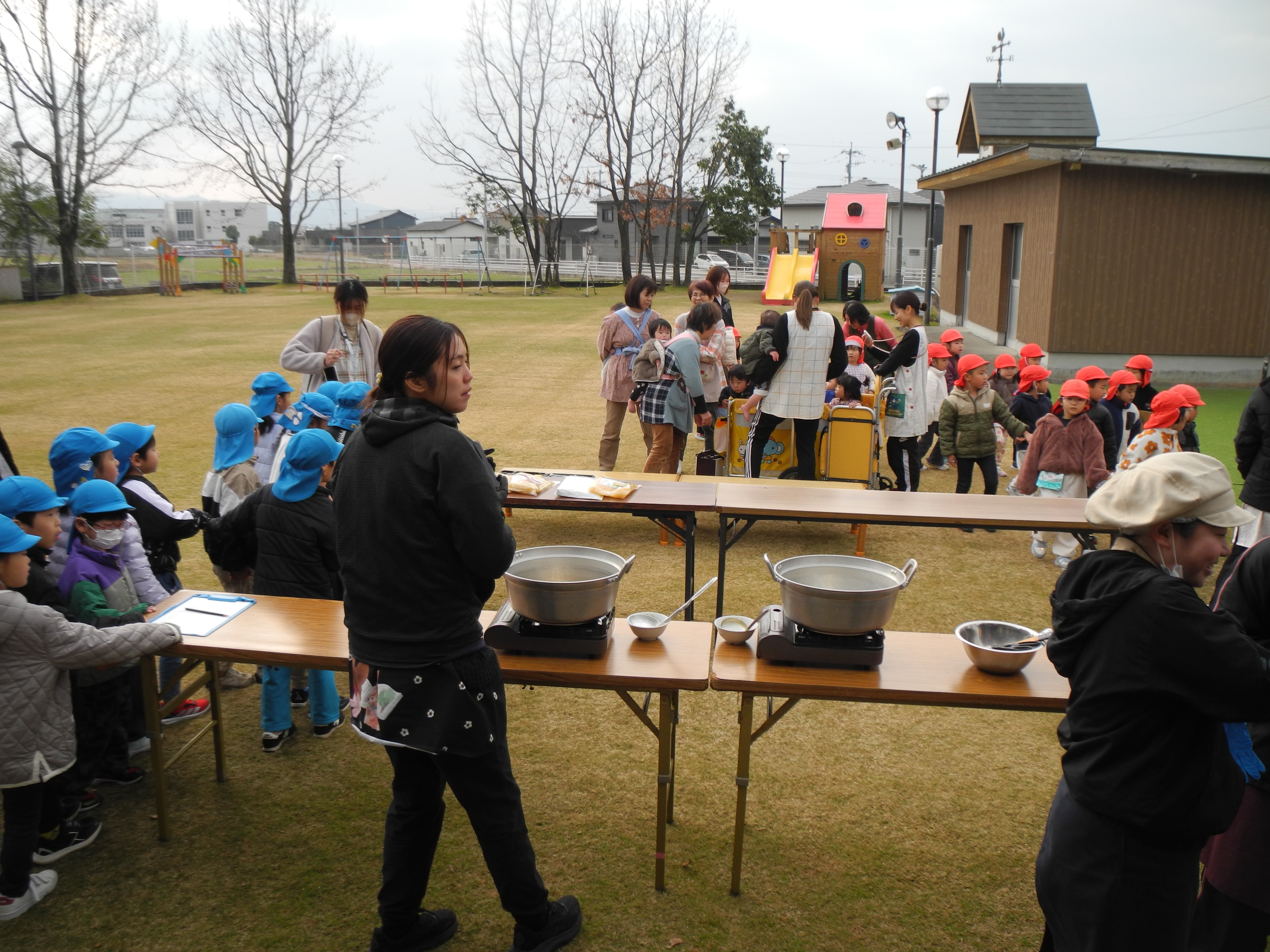 レベル4の水害が予想され、彼杵川が氾濫する想定で防災訓練を行い、常明園さんまで避難する訓練でした。その後給食の先生達が外での炊き出しを行いカレー、うどん、フルーツポンチを皆で食べました。