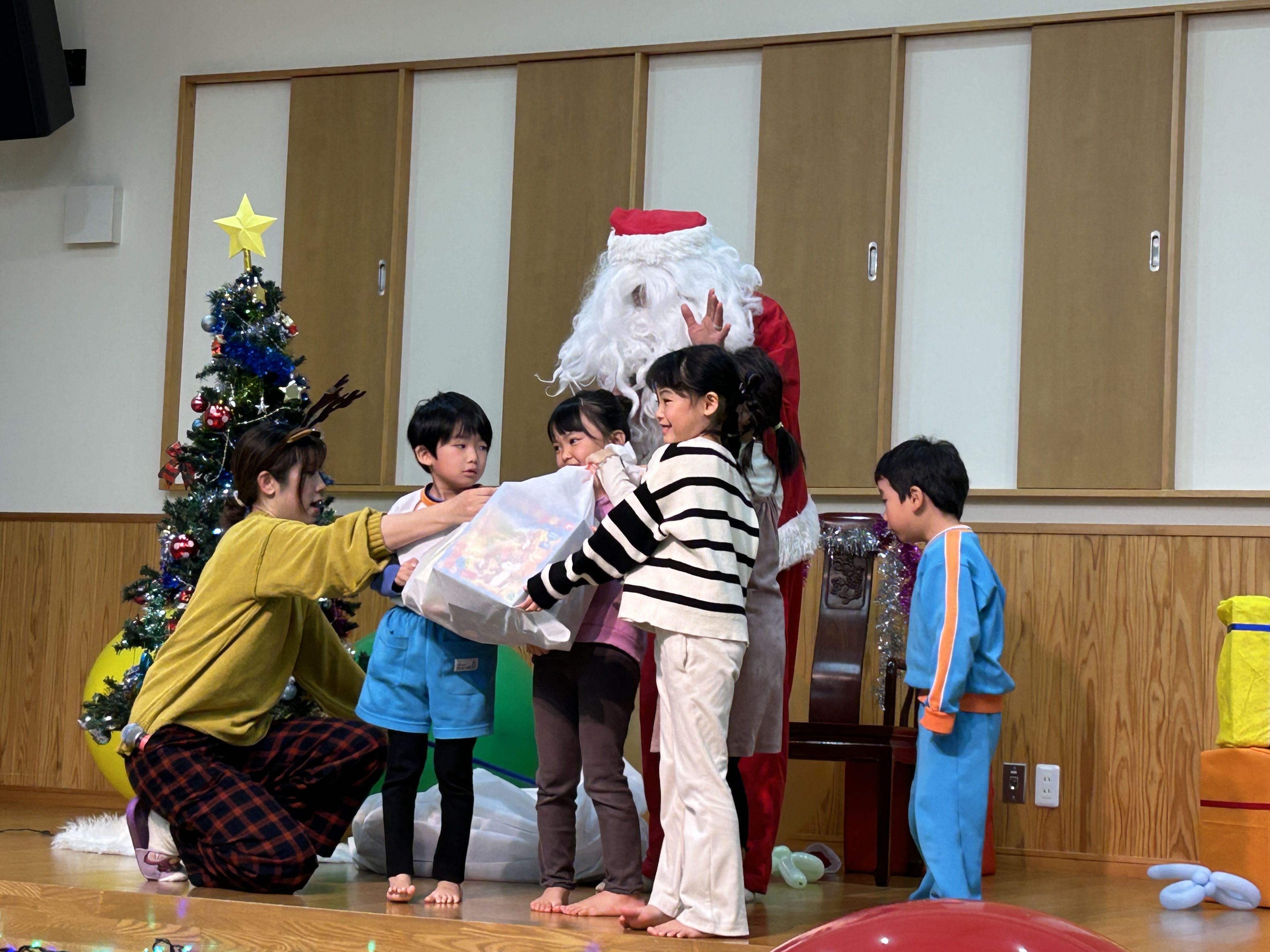 やまだこども園で先生達と一緒に大きな風船でいっぱい遊びました。しばらく遊んだ後、子ども達から「サンタさ~ん」と呼ぶ声が聞こえてきました。すると大きな大きなお土産を持ってサンタさんが登場!!お友達と仲良く遊べる玩具をたくさんいただきました。