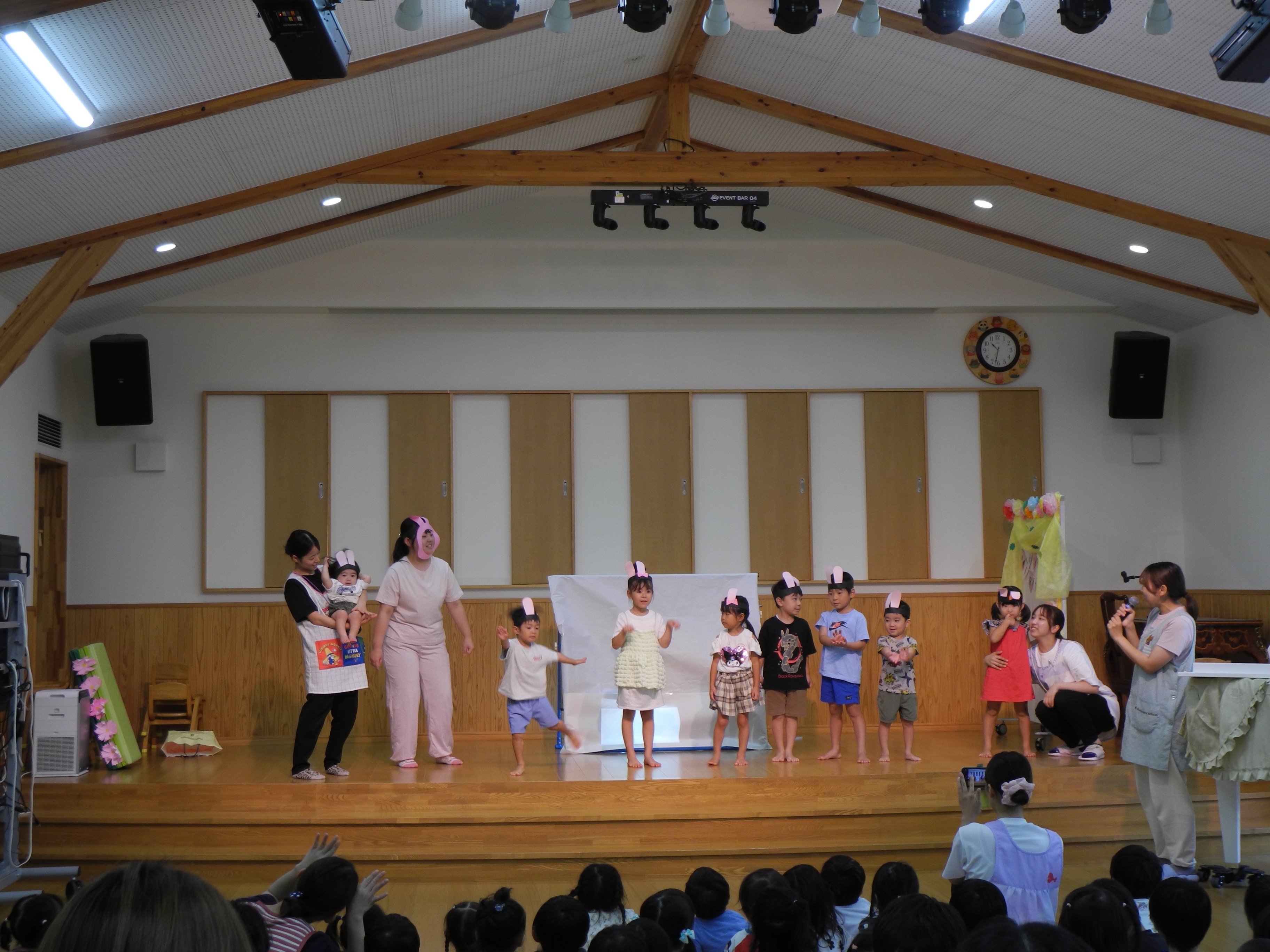 6月うまれの誕生会です。今回はケロポンズになりきった先生達による「ケロポンズコンサート」でした。誕生者も会場の子ども達も先生達もみんな参加しての「エビカニクス」のダンスはとても盛り上がったコンサートでした