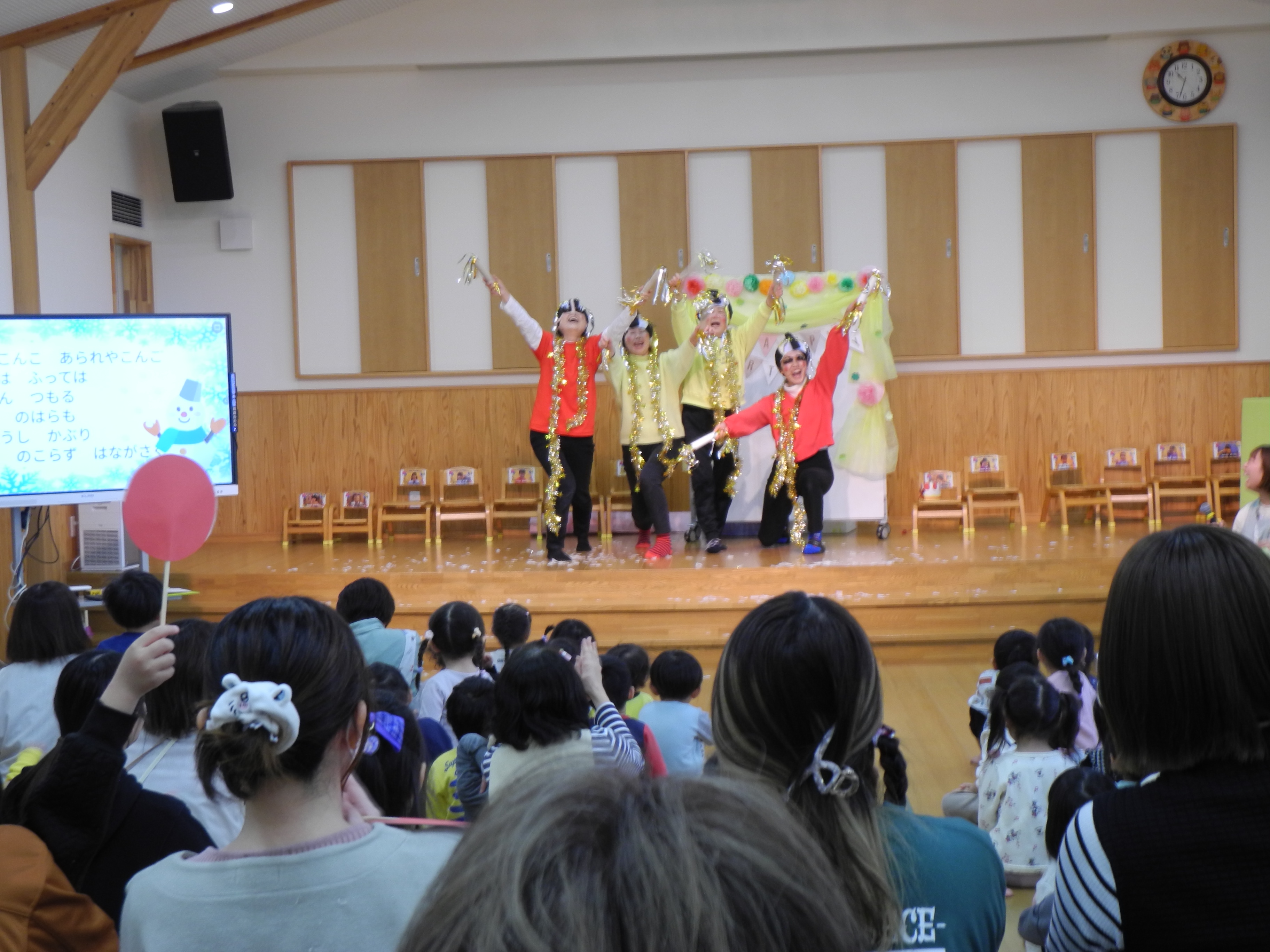 今日は12月生まれの誕生会がありましたが誕生者がとても多くてメッセージは年長クラスのみに。ご両親からの愛情いっぱいのお言葉ありがとうございました。その後は紅白歌合戦が始まり、審査待ち時間には、ゲストが登場し踊りを披露していただきましたよ。